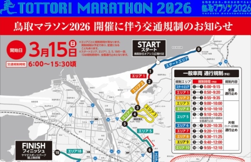 3/15(日)は、鳥取マラソン開催のため交通規制が実施されます(JGAハンディ競技開催日)。